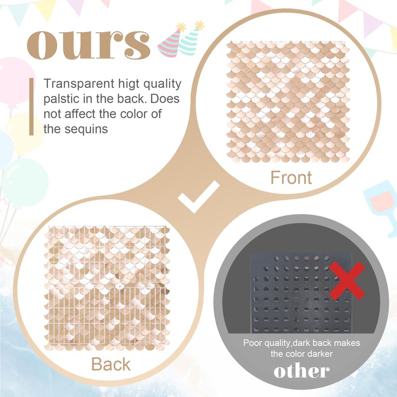 • EASY-TO-INSTALL: Shimmer wall backdrop is super easy to set-up. Each panel comes pre-assembled, just only align it on two sides with the buckle and fasten it directly. Then match shimmer wall panels with invisible nail hangers or cable zip ties, use your imagination to combine different sequin panels into unlimited shapes and sizes, and mount it wherever you wish.