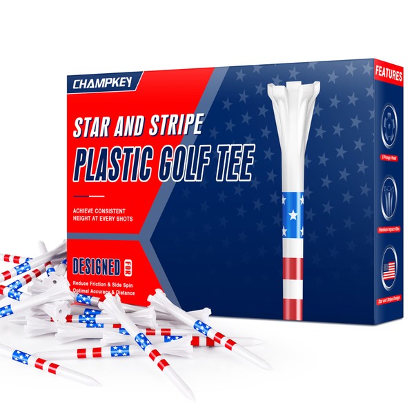 CHAMPKEY 5 Prongs Plastic Golf Tees 100 Pack - Star and Stripe Marking System Golf Plastic Tees - Lower Friction and Longer Distance Golf Tees (2-3/4")