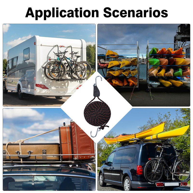 - Strong Material : The kayak tie down straps are woven with polypropylene material, which is tough and not easy to break, and can be adjusted to any length as needed. Built-in metal pulleys and 2 S-shaped hooks made of iron galvanized material are not easy to rust and ensure long-term use.