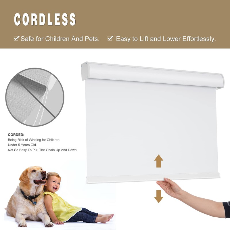 - SAFE AND EASY TO PULL: The cordless roller shade can prevent your child and pet from contacting and causing danger,and it will stay at whatever position you stop.You can park anywhere to meet your different needs for brightness and light