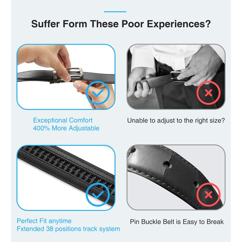 - FOR EXACT FIT - Ratchet belt for men allows for up to 1/4" adjustments for perfect fit everywhere. The leather belts for men features an easily removable buckle that allows you to cut the brown belt men to your ideal size.