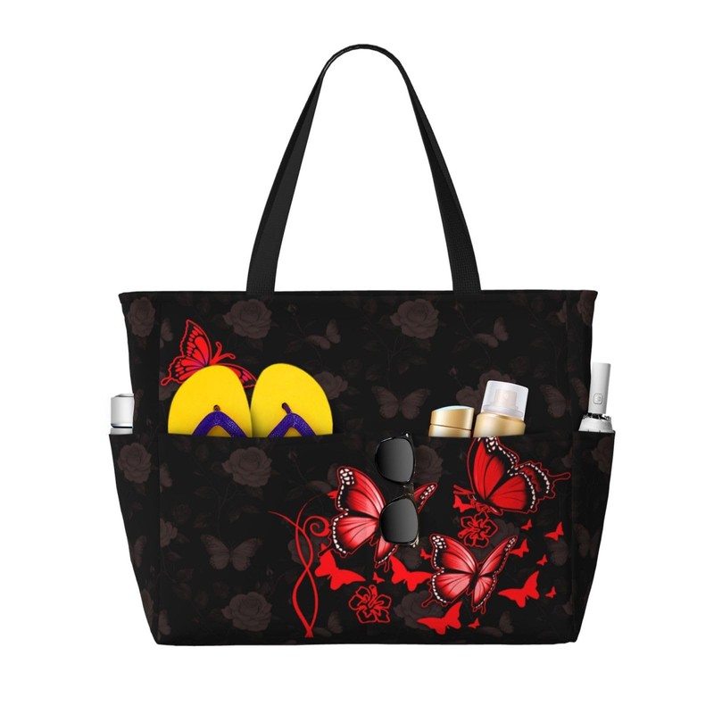 CHAOS MONKEY Women Large Beach Bag Red Butterfly Flower Print Sandproof Waterproof Travel Weekender Foldable Tote Bag for Pool Vacation Gym
