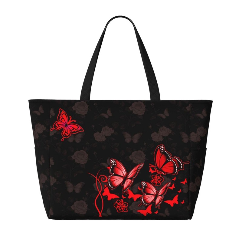 CHAOS MONKEY Women Large Beach Bag Red Butterfly Flower Print Sandproof Waterproof Travel Weekender Foldable Tote Bag for Pool Vacation Gym