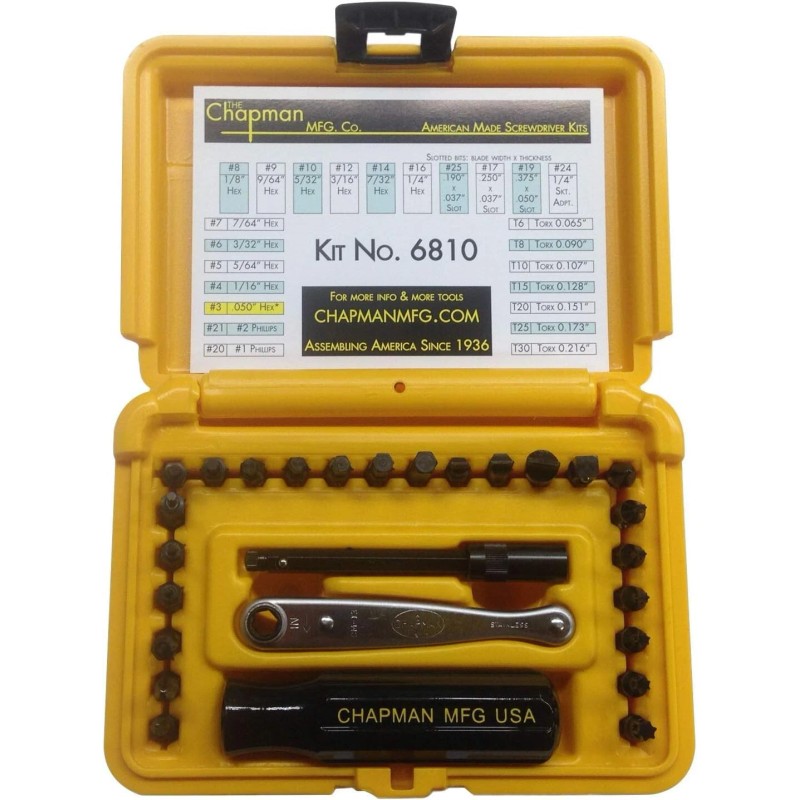 Offset Inch/Torx Screwdriver Kit - 27 piece kit contains a Miniature Ratchet, extension and Screwdriver Handle plus the following adapters: Eleven (11) Allen Hex type adapters (size dist. across flats): .050", 1/16", 5/64", 3/32", 7/64", 1/8", 9/64", 5/32", 3/16", 7/32", 1/4"; Three (3) slotted head adapters (Size blade width): 3/16", 1/4", 3/8"; Two (2) Phillips head adapters: No. 1 and No. 2; One (1) 1/4" square drive adapter (box sockets not supplied); and Seven (7) Torx adapters: T-6, T-8, T-10, T-15, T-20, T-25, T-30 Guarantee: All Chapman Tools are fully guaranteed to be as represented and free of all defects caused by either defective materials or faulty workmanship.