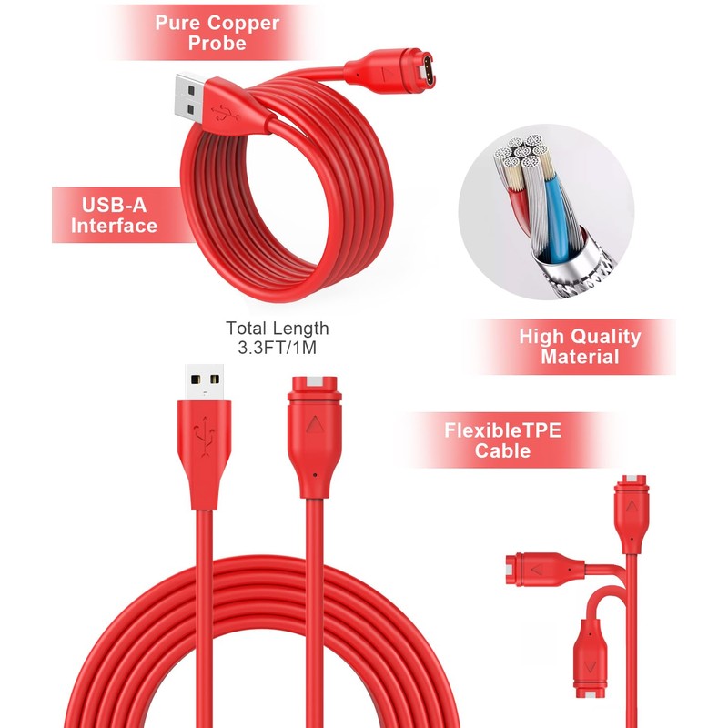 Charger Cable for Garmin Fenix 7 7S 7X 6 6S 6X Pro,5 5S 5X Plus,1M charging cable for Garmin,Compatible with Venu/Venu 2/Venu 2S/Venu SQ 2/VenuSQ/Vivoactive 3(Red)