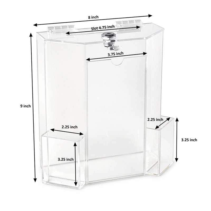 - SAFETY & DISPLAY FEATURES: Each donation box comes with secure pad lock and 2 keys. Insert your display sign into the front slide-in displayer acrylic poster frame to present your message, your goal and your donors, plus two side pockets for pamphlet or card display.