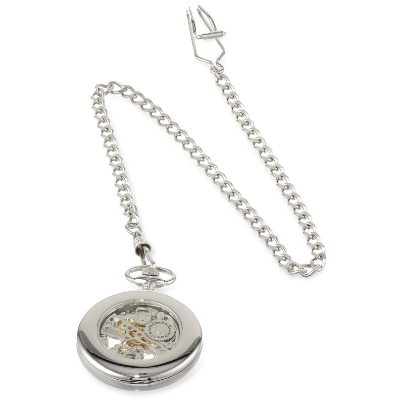 - Chrome finish brass 41mm open face case with a matching curb chain