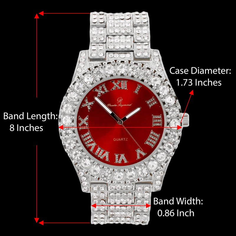 Charles Raymond Mens Silver Big Rocks with Roman Numerals Fully Iced Out Colorful Dial Watch - ST10327 RN Single (Blood Red/Silver)