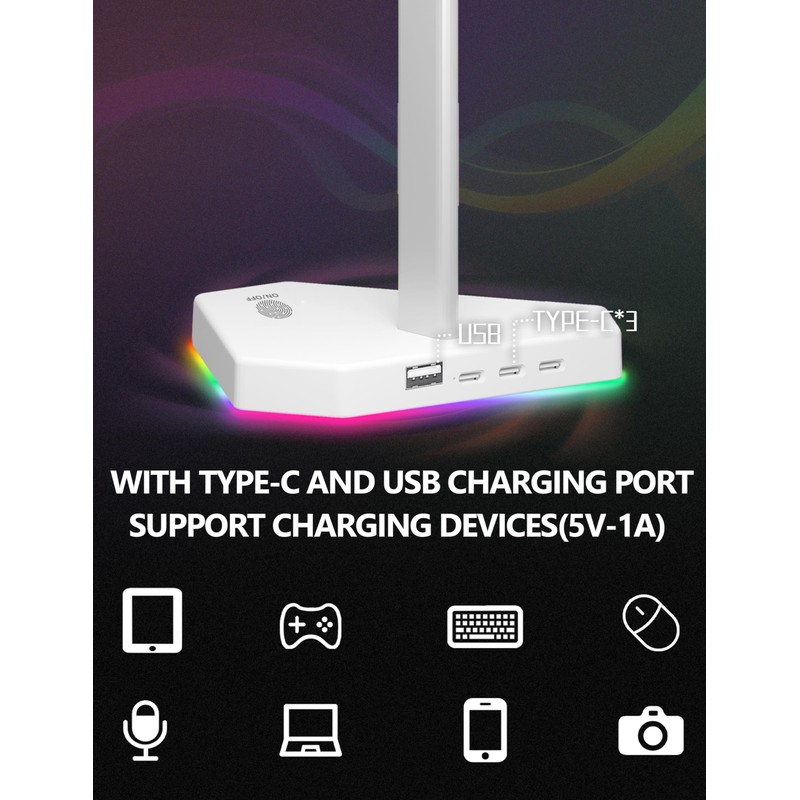 charlxee RGB Headphone Stand with 2 USB-C Charging Port and 1 USB Charging Port, Desk Gaming Headset Holder with 7 Light Modes and Non-Slip Rubber Base Suitable for All Earphone Accessories (White)
