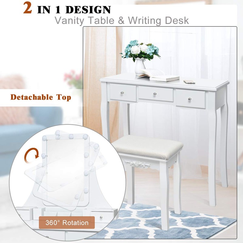 - 【Elegant and Simple Vanity Table Set】: Simple and elegant design with crystal handles and square mirror, this beautiful and practical vanity set is the sturdy furniture of your bedroom, bathroom or hallway. With the removal of mirror top part, the makeup table could be used as a writing or laptop desk.