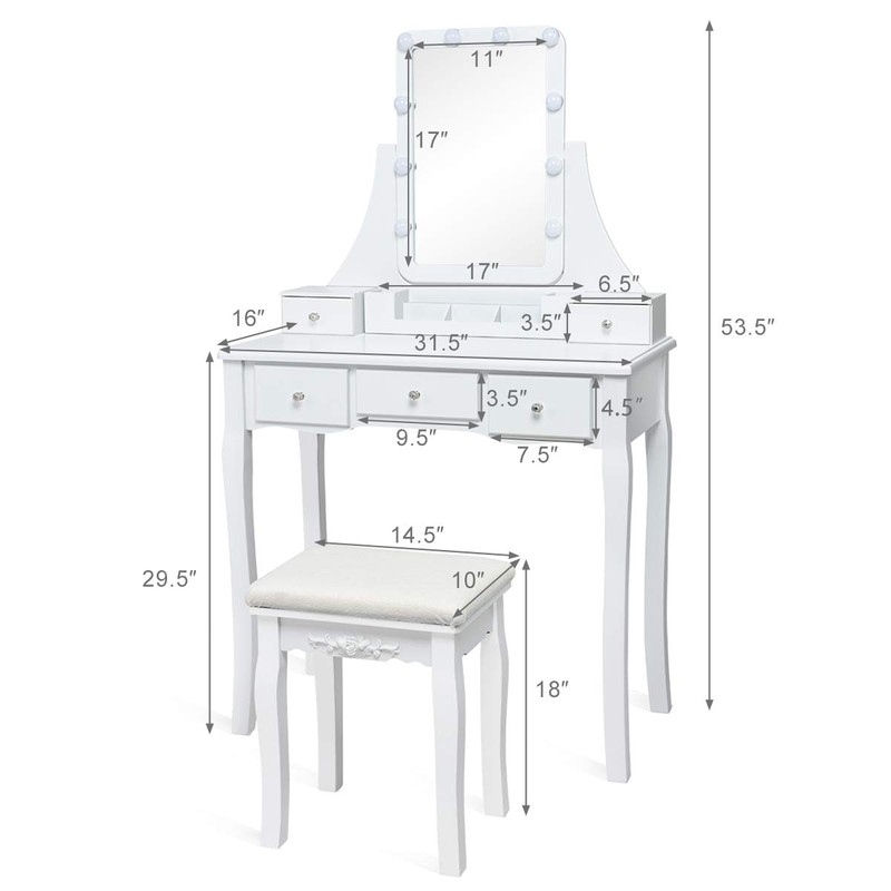 - 【Durable Structure & Solid Wood Legs】: The pine legs of the dresser and the rubber-wood legs of the stool ensure the stability and solidity of the vanity set. The safety design of anti-toppling fitting and anti-slip mats not only prevents the dresser from tipping over, but also protects the floor from scratches. Besides, high quality LED lights and UL - certified adapters ensure safe use.