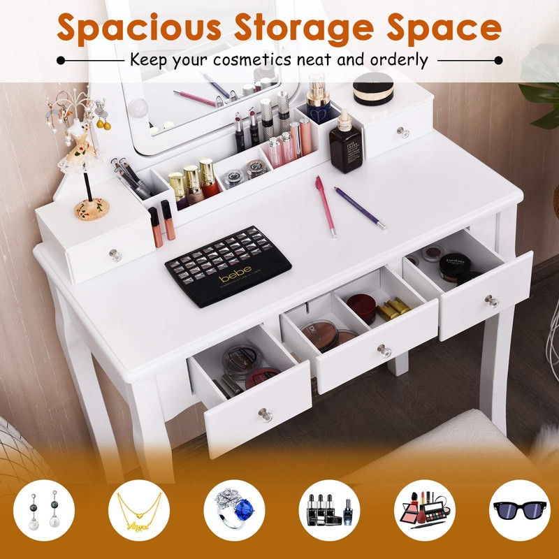 - 【5 Large Drawers & Detachable Organizers】: Spacious desktop and 5 drawers provide ample storage space for your cosmetics. 6 compartments on the desktop and 2 DIY dividers in the middle drawer can help you better classify your items so that you can use space efficiently. Get rid of clutter in your room and give yourself a tidy home.