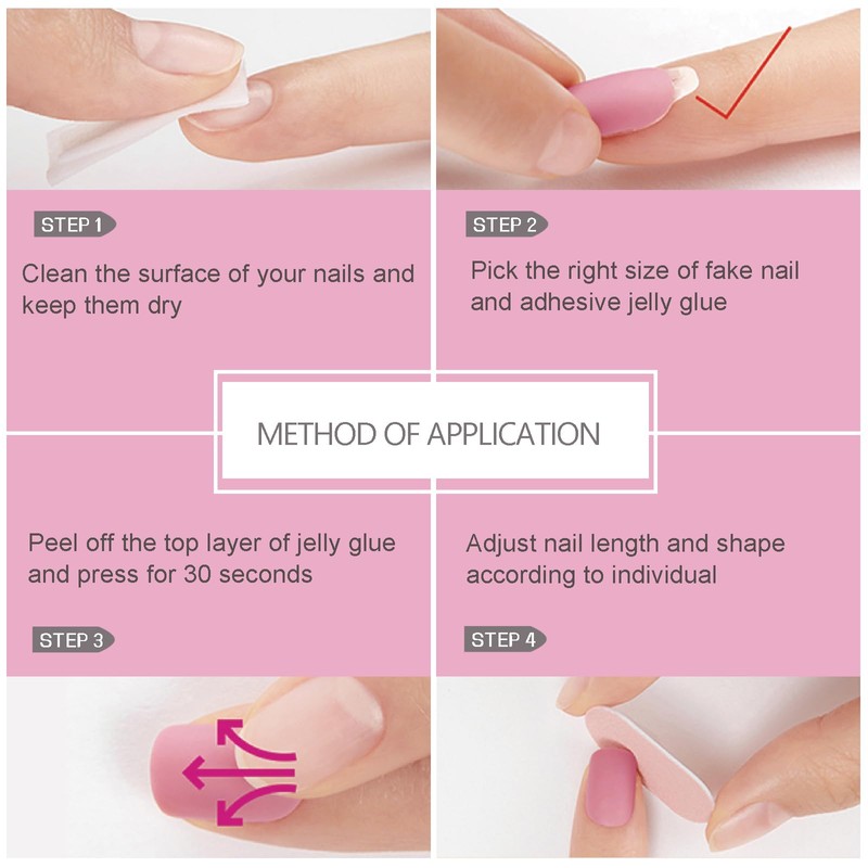 - Package: You will receive a box of 30 pieces of semi-handwork fake nails, which contains 30 pieces of jelly glue, a nail file and a cuticle removal stick. (In order to facilitate storage and carrying, we use small box packing, the box is about 3.93in*1.77in.)