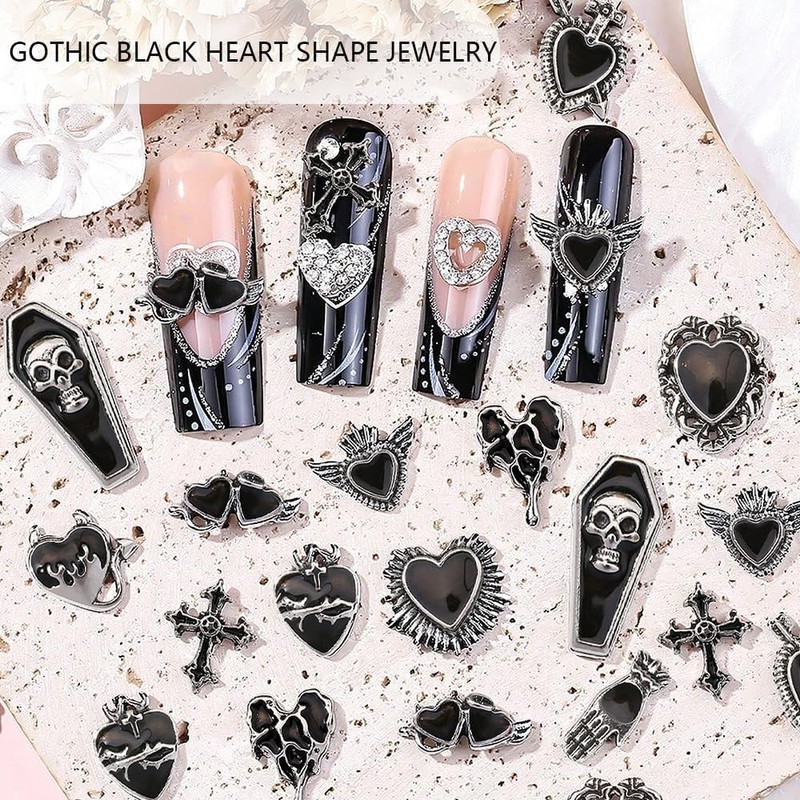 - Various designs: devil hand, eternal cross, flying heart, twins good and evil, devil break, devil heart, lava love heart, arrow through the heart, heart-shaped magic mirror, heart of thorns, skull tombstone, winged heart. The nail charms are made of a metal alloy base and are edged with dripping oil gel. Each style of jewellery has a distinctive design