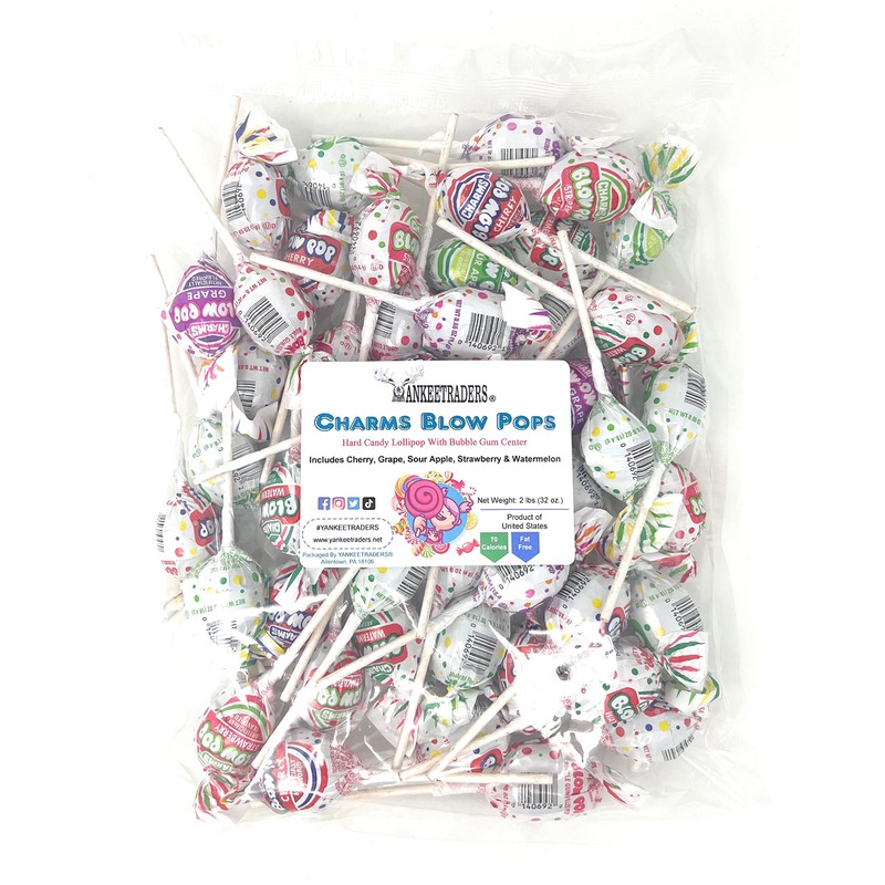 Charms blow pops are the original hard candy lollipops filled with bubble gum. Try this assorted pack so that you can taste all of the different flavors, including strawberry, cherry, watermelon, grape, and sour apple.