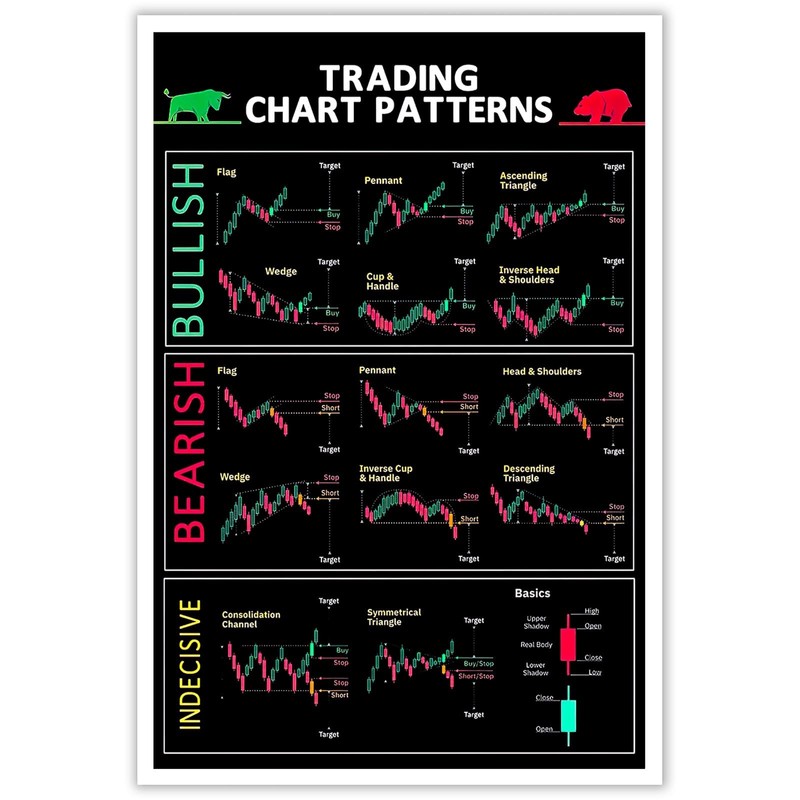 Chart Patterns & Candlestick Patterns Poster - Perfect for Trader Stock Ticker Technical Analysis, Office & Home Wall Decor(12x18inch-Unframed