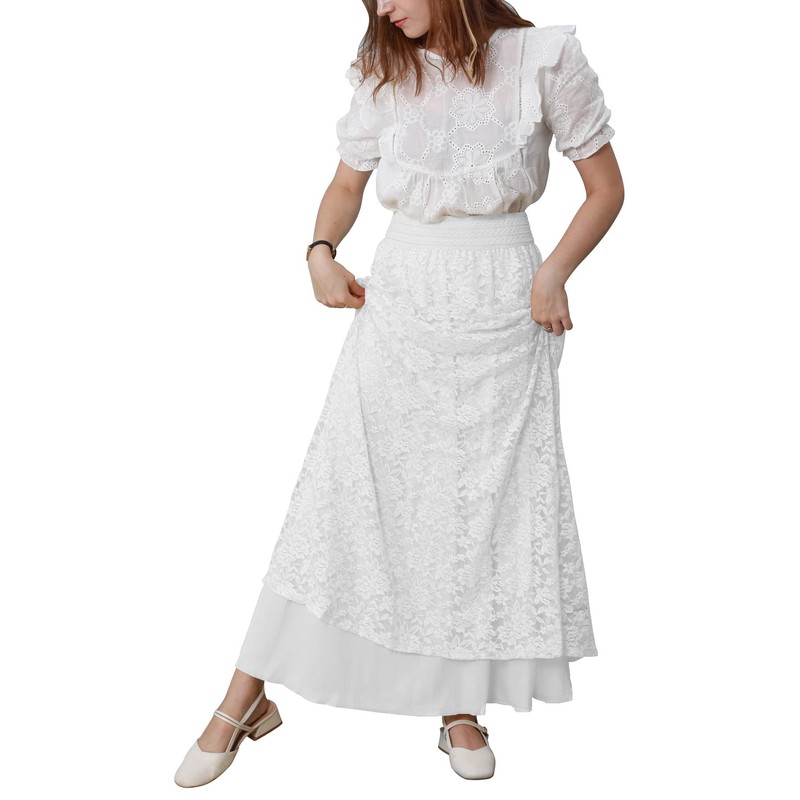 CHARTOU Womens Elegant Floral Lace Elastic High Waist Pleated Maxi Long Beach Skirts, White, Medium