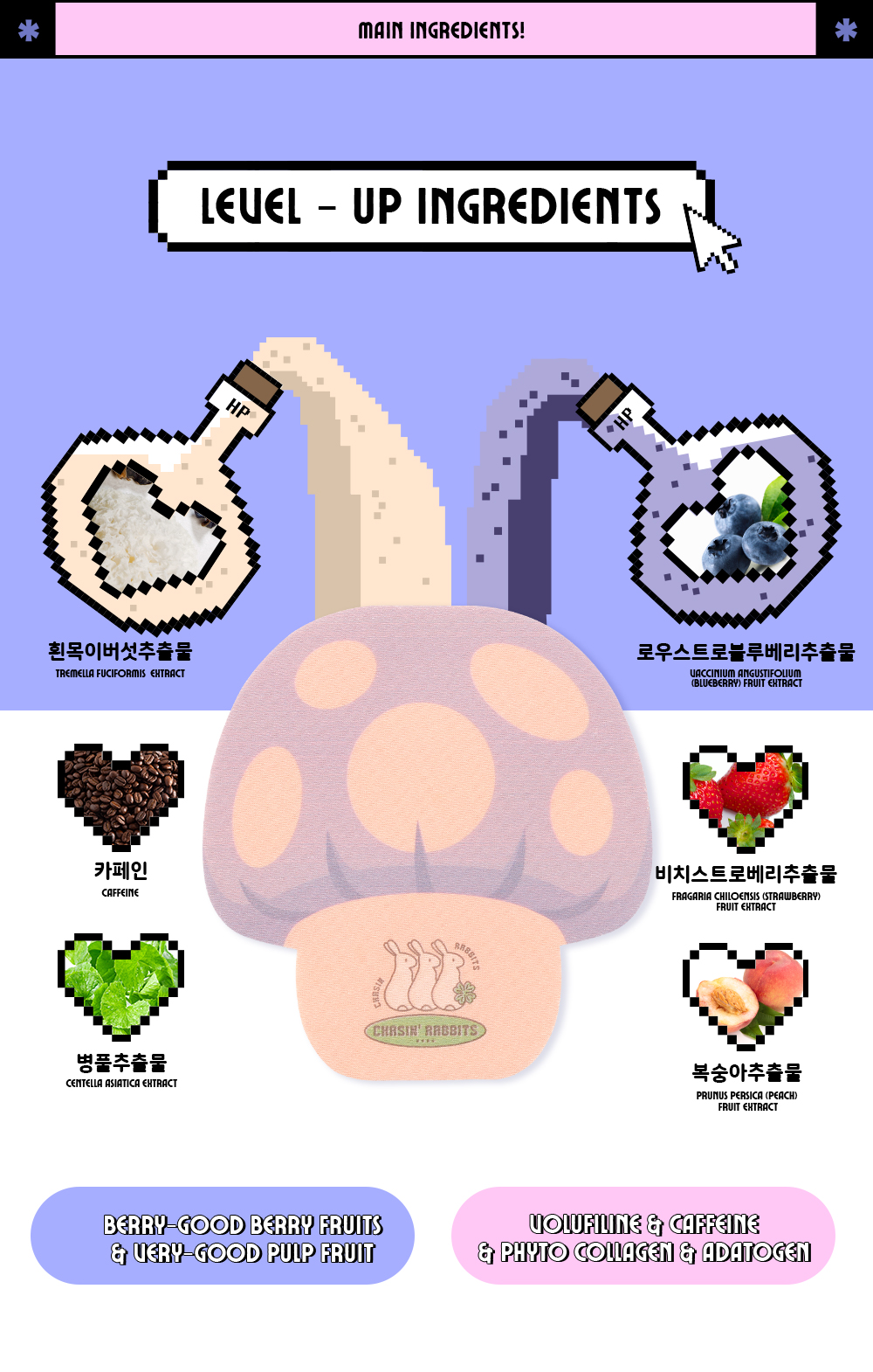 - all ingredients that must be specified according to the Cosmetics Act: Water, Glycerin, Sodium Polyacrylate, Carbomer, 1 2-Hexanediol, Centella Asiatica Extract, Cellulose Gum, Polyacrylic Acid, Dipotassium Glycyrrhizate, Caprylyl Glycol, Tartaric Acid, Menthyl Lactate, Prunus Persica (Peach) Fruit Extract, Inonotus Obliquus (Mushroom) Extract, Disodium EDTA, Phellinus Linteus Extract, Aluminum Glycinate, Fragrance, Caffeine, Lycium Chinense Fruit Extract, Hydrogenated Polyisobutene, Tremella Fuciformis (Mushroom) Extract, Butylene Glycol, Fragaria Chiloensis (Strawberry) Fruit Extract, Vaccinium…