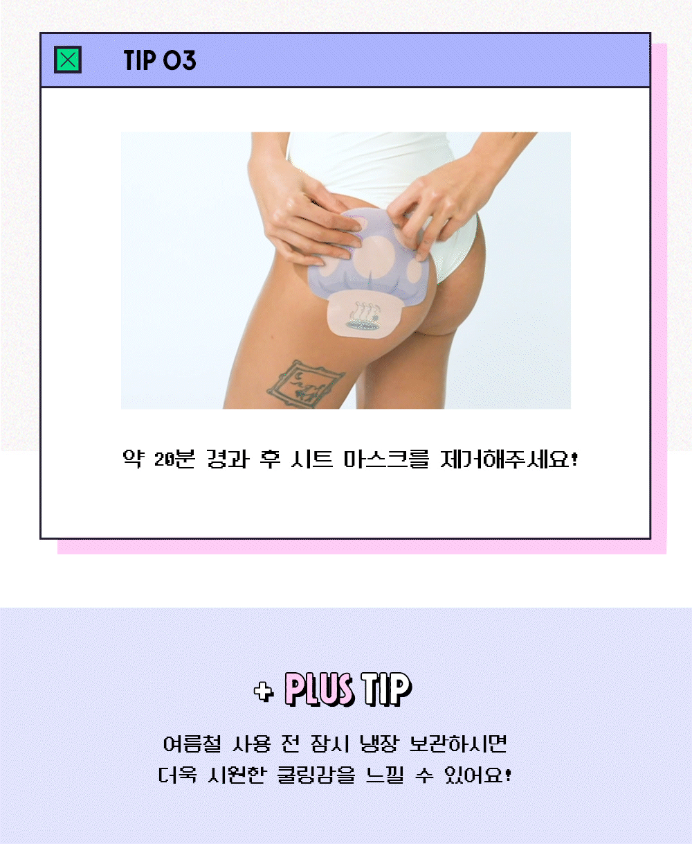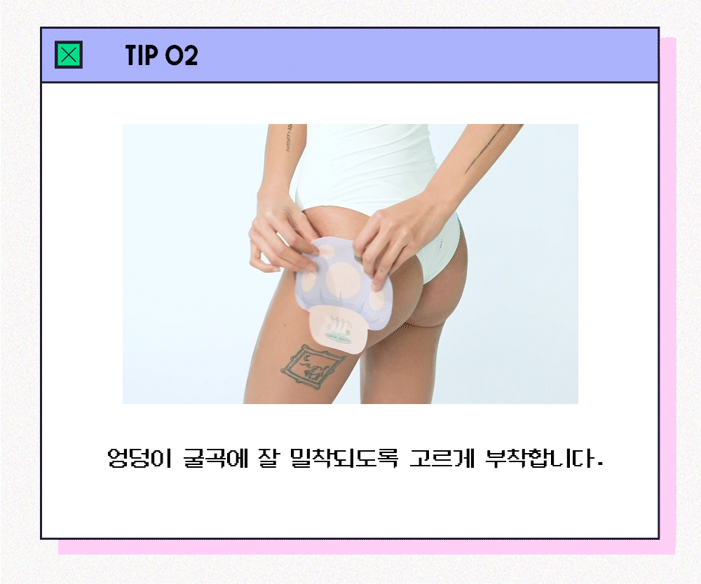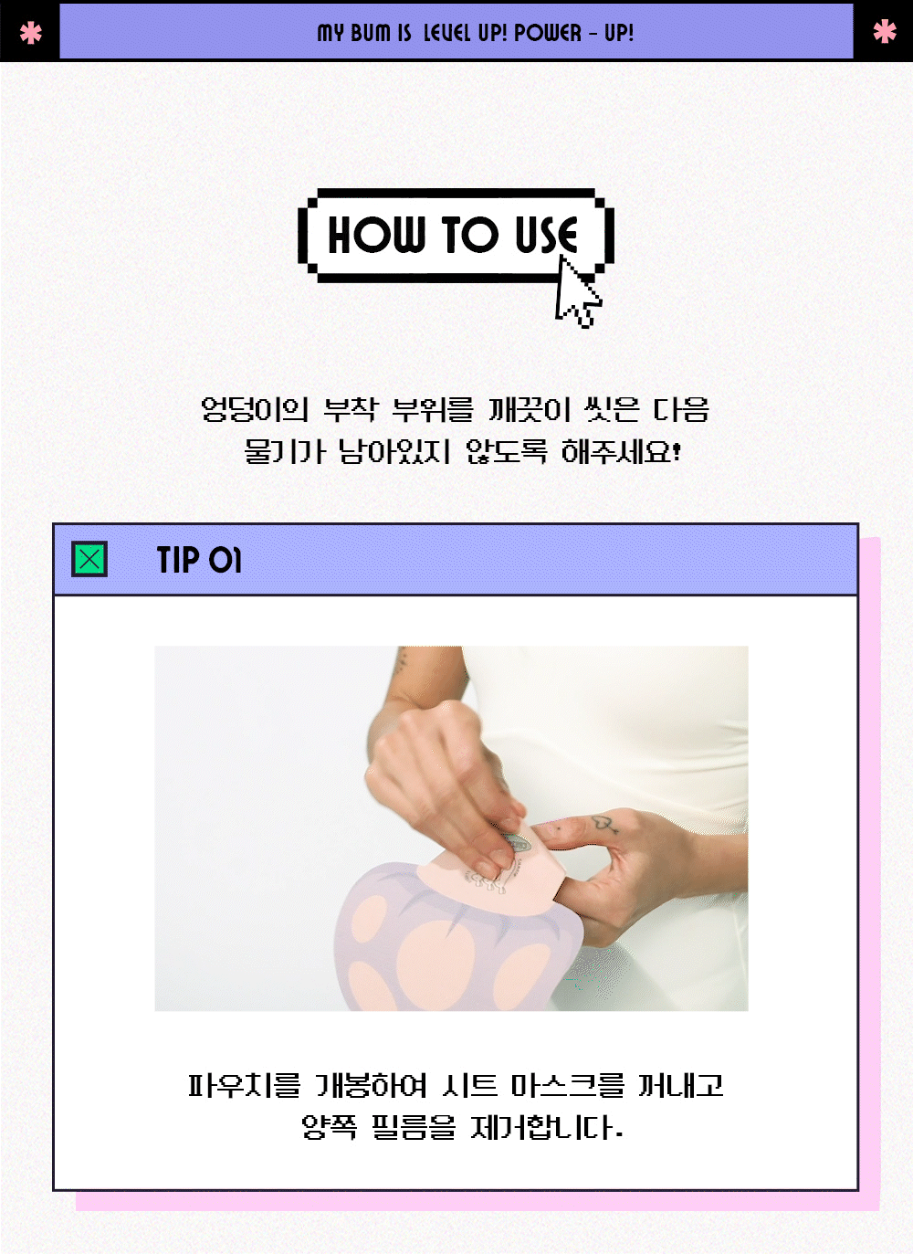 - usage: 1. Cleanse your buttocks with warm water and let dry. 2. Open the pouch, take out the sheet mask, and remove the films on both sides. 3. Attach it evenly so it fits well over the curves of the buttocks. 4. After about 20 minutes, remove the sheet mask.