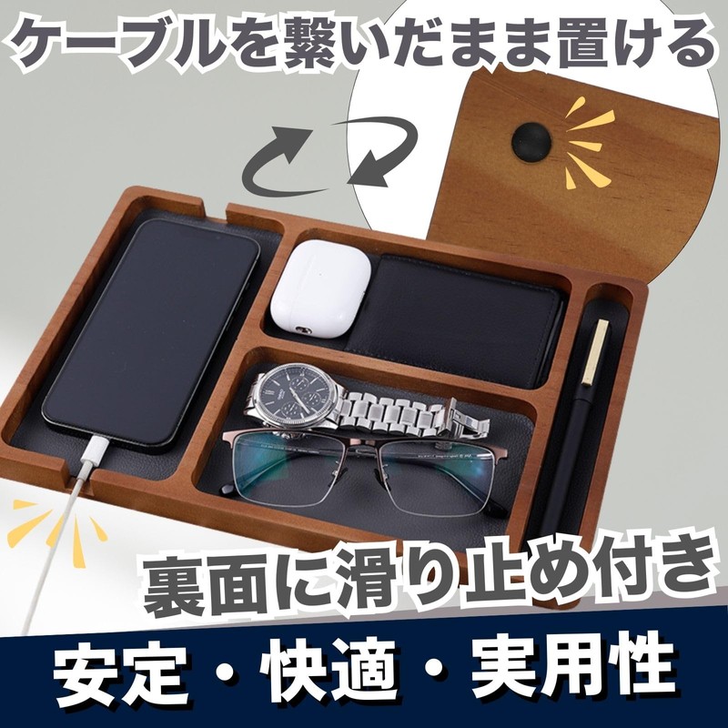 - 木製フレームとPUレザーを組み合わせた上質な卓上トレー。スマホ置きやペンホルダー、小物入れやアクセサリートレイとして活躍。デスクや玄関、ベッドサイドで財布・鍵・時計をスマートに収納できます。