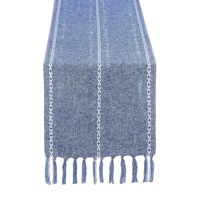 Chassic Rustic Farmhouse Style Linen Table Runner, Boho Handmade Tassel Hemstitched Embroidered Table Runners 108 Inches Long for Holiday Party, Dresser and Dining Decorations, 13 x 108 inch - Blue