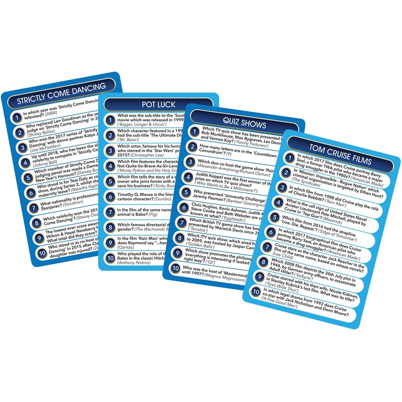 - Subjects include TV, film, music, sport, people, geography, history, art, literature, food, drink, science, nature & general knowledge