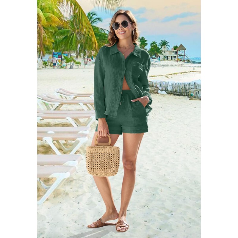 - Muslin shorts with 2 pockets, adjustable drawstring and elastic waistband, which makes them not only stylish, but also functional. Women's lounge set is your first choice at home or on beach holidays. Enjoy the comfort of our loungewear women's set, specially designed for the needs of modern women.