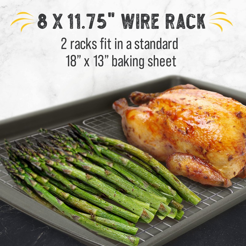 - Great Size: At 8” x 11 ¾, this oven rack set will fit in most standard ovens and cookware sheets. You can slide them over your pan to elevate your food from fat and grease for a healthier meal.