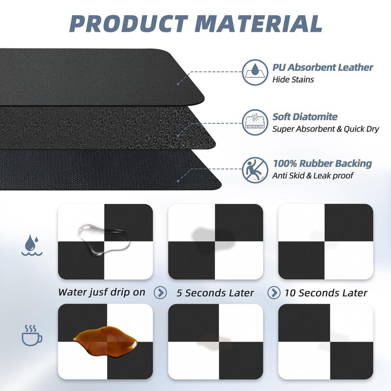 • Higher Quality Materials & More Durable - Made from top-quality materials, PU Absorbent Leather surface, containing absorbent sofe diatomate and rubber base. Our dish drying mat is built to withstand daily use, ensuring it remains in excellent condition for years. The rubber backing provides a non-slip grip, keeping the mat securely in place