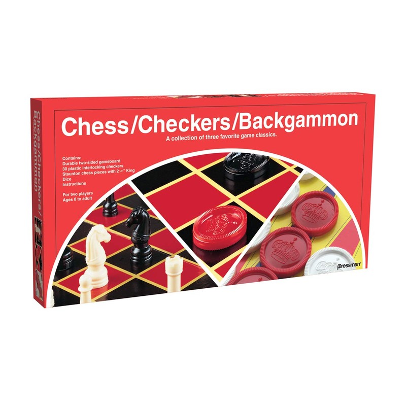Introduce your family to three classic games (Checkers, Chess, and Backgammon) that they are sure to love! This three-in-one set includes interlocking checker pieces, and full-sized Staunton Chess pieces with a 2. 5" King. A perfect keystone for your game collection. For 2 players, ages 8 and up.