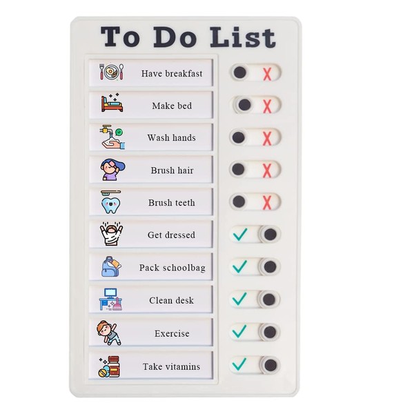 Description: The vellichor reusable to-do board is an essential tool for children to manage their daily tasks and responsibilities. With the help of the board, children can visually organise their tasks by marking the tasks from "unfinished" to "done". This not only helps to promote responsibility and organisation, but can also strengthen children's self-efficacy and increase their self-confidence. The package includes a control board, 2 double-sided stickers and 4 blank papers so children can create their own to-do checklist and housework list. Children can add their own tasks and gradually unhook them when they are done. This gives them a sense of control and satisfaction when they achieve their goals. The board can be easily glued or hung on the wall and offers space for a variety of tasks. It is reusable and can be used for a long time, making it a sustainable choice for parents and families. As a parent, you want to make sure your child is responsible and organised. The vellichor to-do board is a great tool to achieve just that. It helps children prioritize their tasks and complete successfully. At the same time, it gives them the feeling of having achieved something and achieving their goals. It is a simple but effective