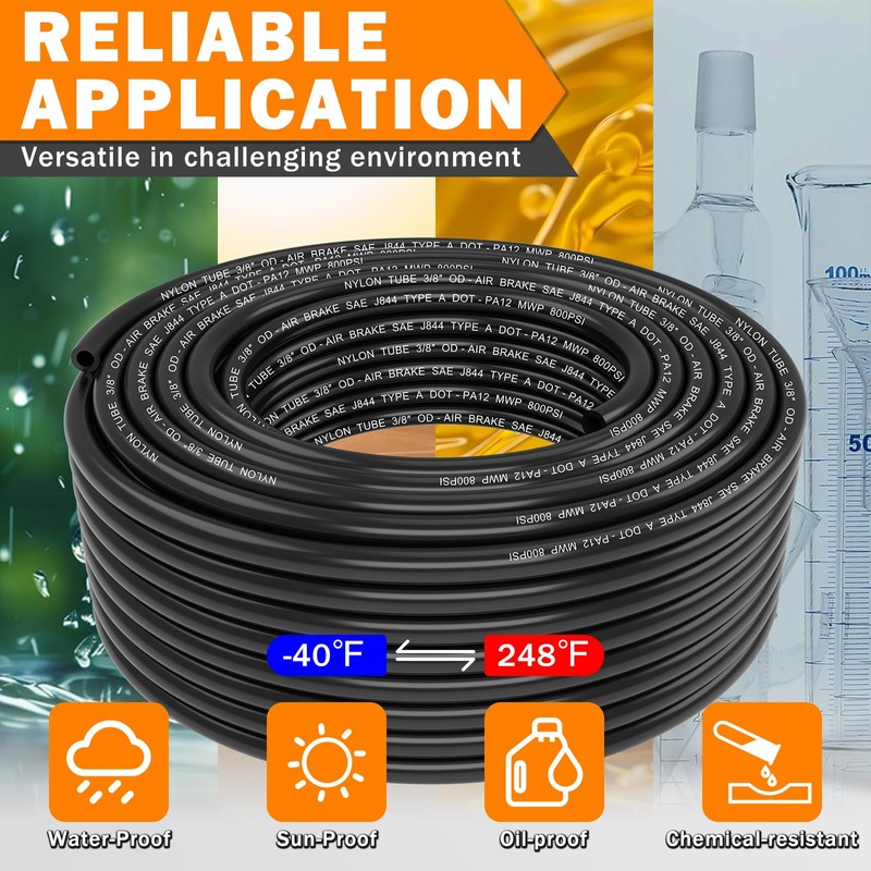 - PREMIUM PA12 DOT AIR LINE: CheeMuii DOT air hoses are made of high-quality Polyamide 12 nylon, meet D.O.T. FMVSS 571.106 approved, SAE J844 air brake system requirements, with corrosion resistance, high-temperature flexibility, high-pressure resistance and long service life