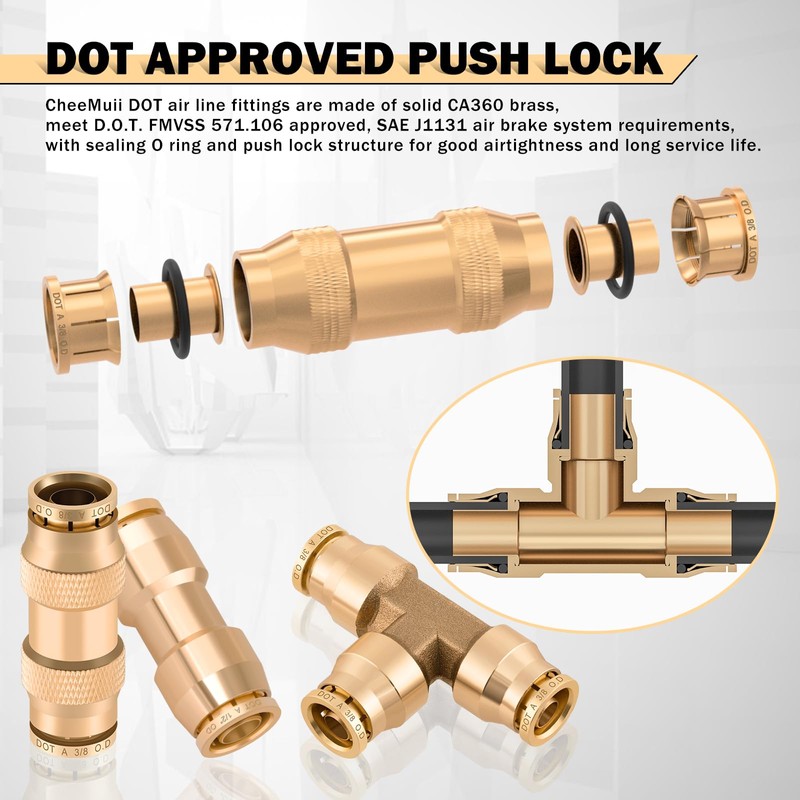- PREMIUM DOT FITTINGS: CheeMuii DOT air hose fittings are made of CA360 pure brass, meet D.O.T. FMVSS 571.106 approved, SAE J1131 air brake system requirements, with corrosion resistance, high-temperature ductility, low permeability and long service life
