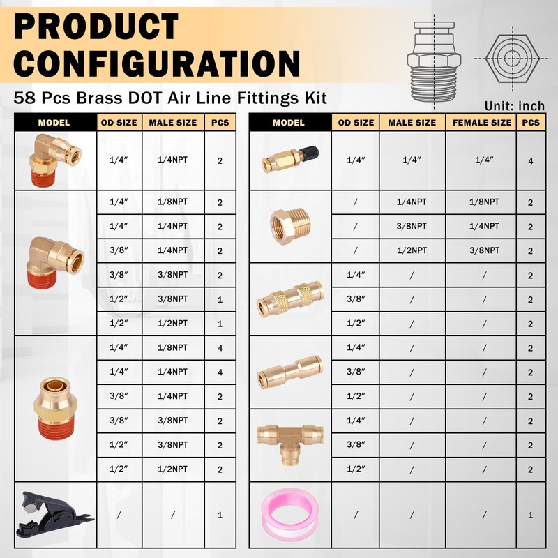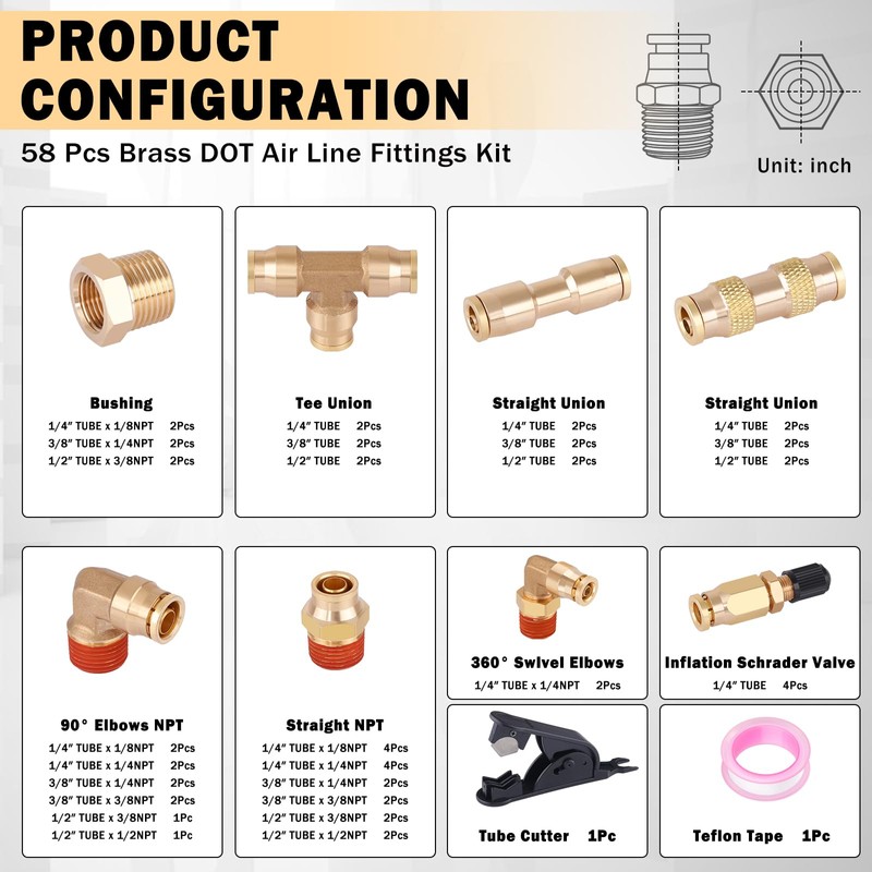 - 58 PCS PACKAGE: The 58 pcs DOT air line fittings assortment includes: 6 pcs brass tube tee fittings, 12 pcs brass straight union connectors, 16 pcs brass straight push & NPT thread, 10 pcs 90°elbows NPT thread, 2 pcs 360° swivel elbows NPT thread, 6 pcs brass bushings, 4 pcs brass 1/4" inflation Schrader valve, 1 pc tube cutter, 1 pc Teflon tape. Air brake line fittings types: 1/8", 1/4", 3/8", 1/2"