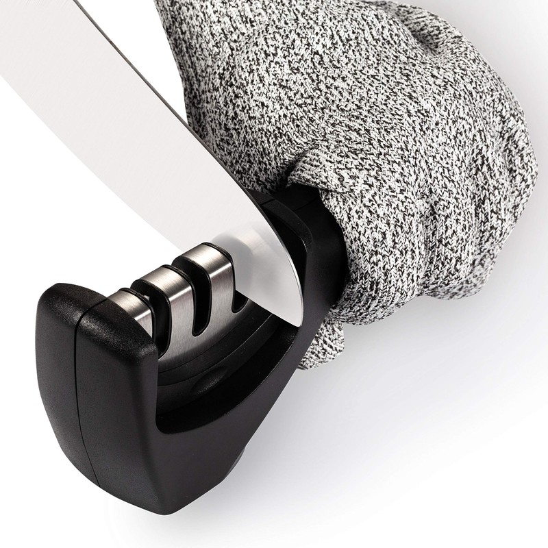 - Extra safety included with a cut resistent glove allows you to sharpen kitchen knives without fear of injuring yorself; non slip base keeps the knife sharpener firmly in place while sharpening knives