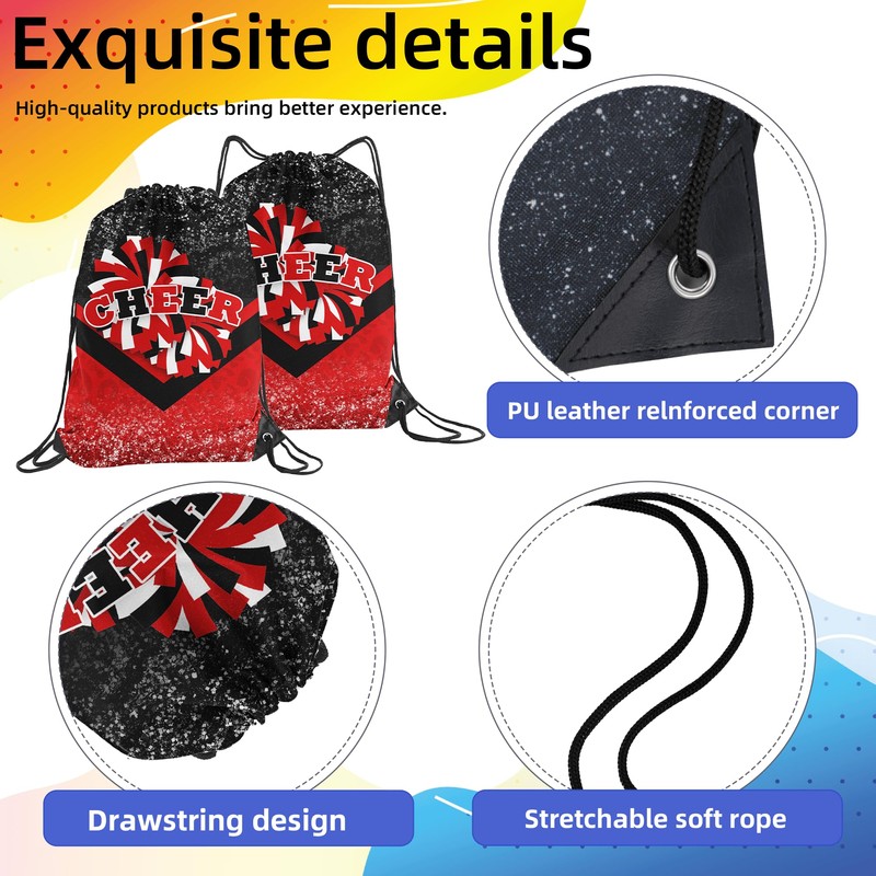 - Quality material: the cheer drawstring bag made from 420D Polyester material, contrasting PU Leather Reinforcement with black trim at the corners, drawstring closure. TIPS: It is printed to look like glitter,NOT actual glitter exterior!