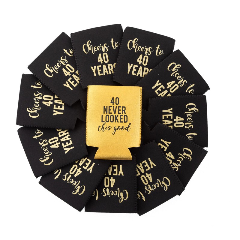 - Each Package includes 11 Black and Gold "Cheers to 40 Years" can coolers and 1 Metallic Gold "40 Never Looked So good" Can Cooler
