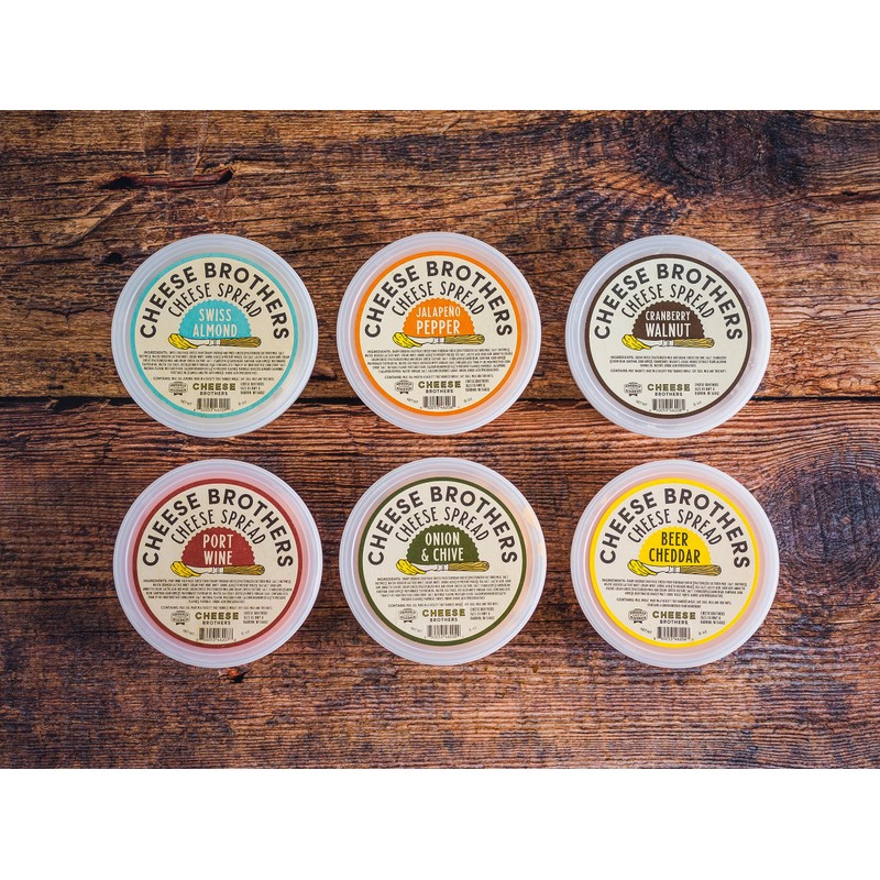 - VARIETY PACK INCLUDES: Six 8-Ounce tubs of Wisconsin-made artisan cheese spread (Swiss Almond, Jalapeno Pepper, Cranberry Walnut, Port Wine, Onion & Chive and Beer Cheddar).