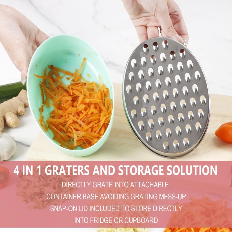 - AIRTIGHT STORAGE CONTAINER & SUPER EASY TO CLEAN - It comes with attachable container base to hold food for mess-free grating, with securely fitting snap on lid. Dishwasher safe, or easily washed with soap and water.