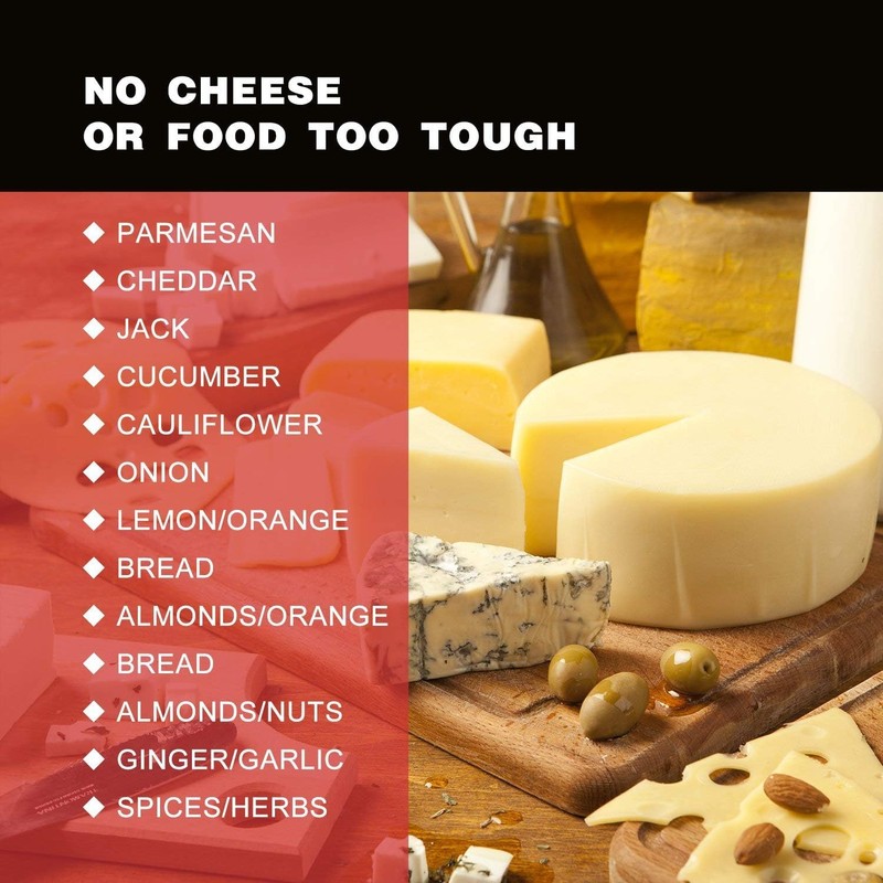 - GRATE ALL TYPES OF CHEESE - One simple cheese grater with container that will completely improve the taste and texture of what you prepare. Try it with Parmesan, Cheddar, Monterey Jack, Wisconsin, Bergenost, Colby-Jack, Edam, Locatelli, Liederkranz, Muenster and more.