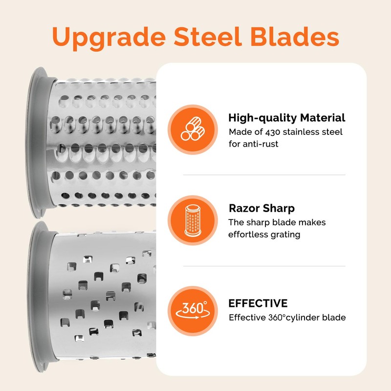 This grater disassembles quickly for easy cleanup, and the ergonomic design ensures you can grate more cheese in less time. The sturdy plastic housing come with hidden drum blades keeps your fingers safe, whether stored in a cupboard or drawer.