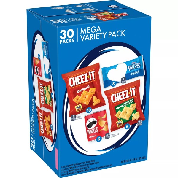 - Variety pack includes Cheez-It Original, Cheez-It White Cheddar, Pringles Original, and Rice Krispies Treats Original snacks