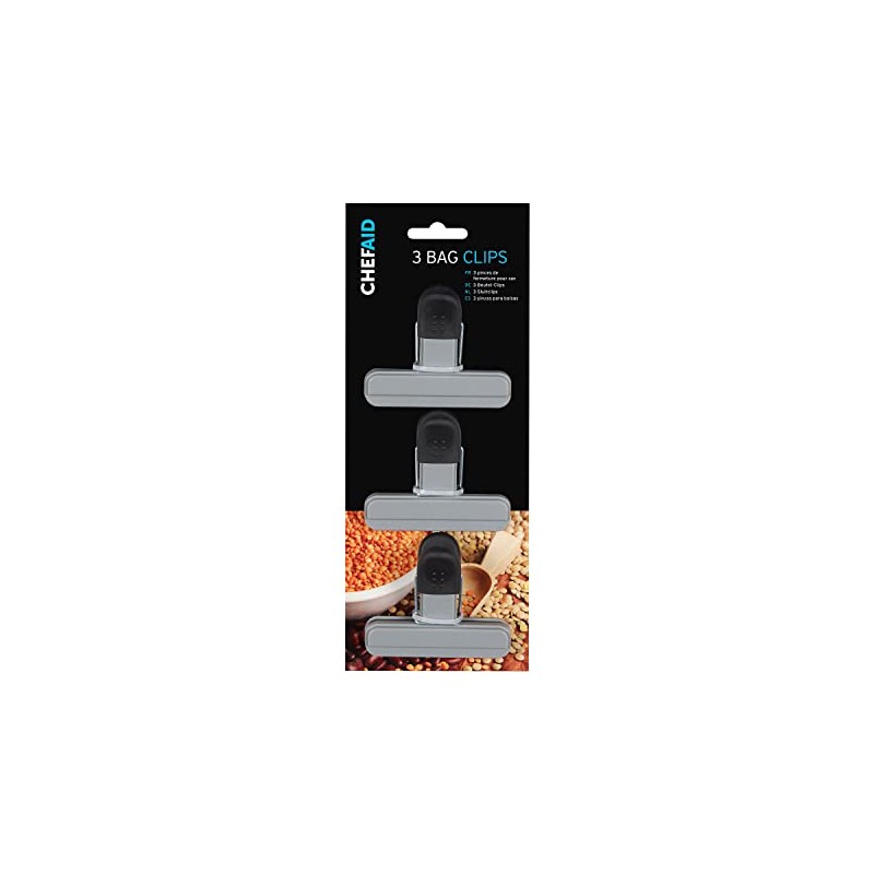 Chef Aid Bag Clips, Pack of 3 Soft-Grip Bag Clips for Keeping Food Fresher for Longer, Made with BPA Free Plastic and Fridge, Freezer and Dishwasher Safe, Grey