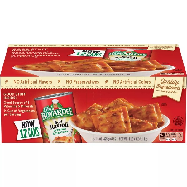 Chef Boyardee Beef Ravioli contains delicious bite-sized pillows of seasoned beef simmered in a rich, savory tomato sauce. Made with quality ingredients, it's free of artificial preservatives, colors and flavors. Chef Boyardee ravioli also contains a half cup of vegetables per serving for added nutritional needs.