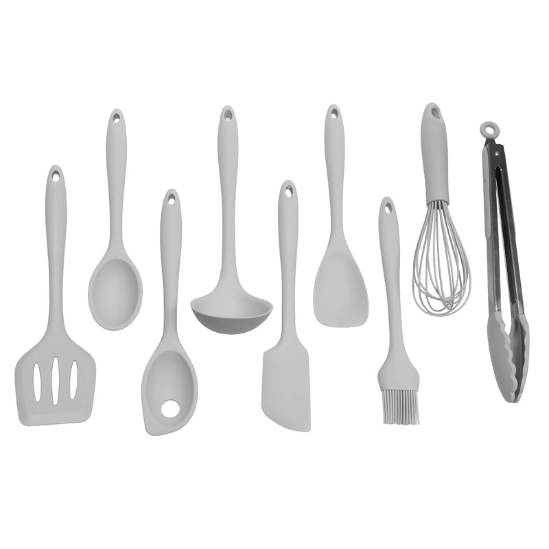 - This 9 piece silicone set includes a turner, basting spoon, mixing spoon, ladle, spatula, spoon, basting brush, tong, and whisk