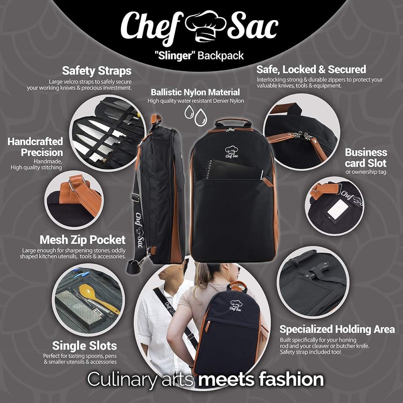- 🔪 HEAD-TURNER DESIGN - 86 the old and get this new backpack knife bag. Chef Sac is chef-inspired & designed to create the ultimate knife carrying case. Designed for Culinary Mavericks and chefs on the move looking for a travel knife bag with a superb sense of style! Reinforced extra-thick, double stitching & heavy-duty zippers help to last through years of kitchen wear & tear. We want to help you make great dishes in the kitchen and make a one-of-a-kind impression when out in the open.