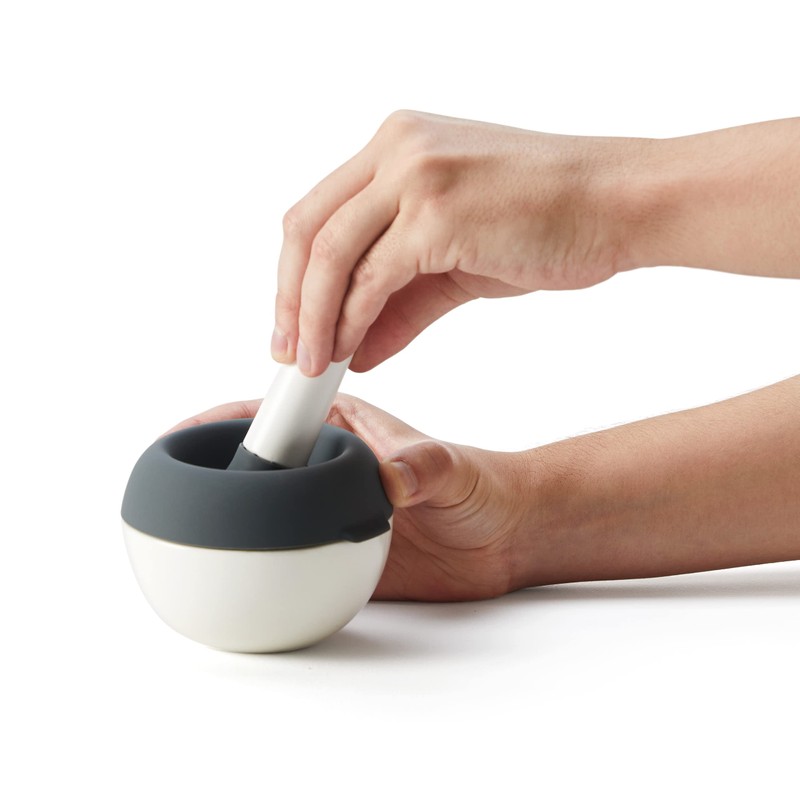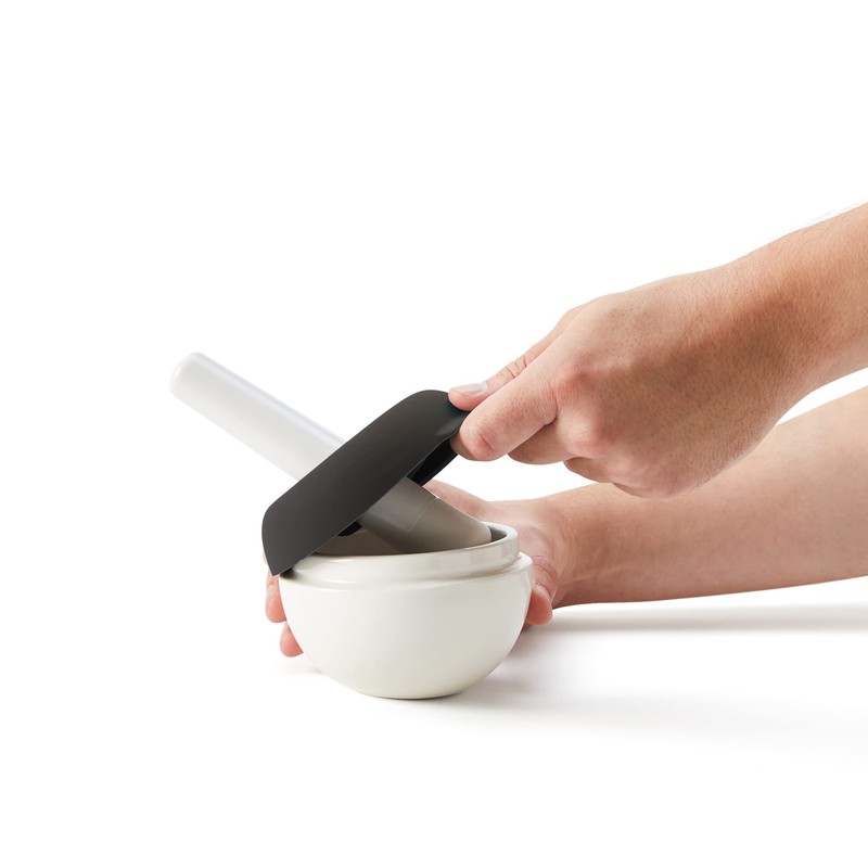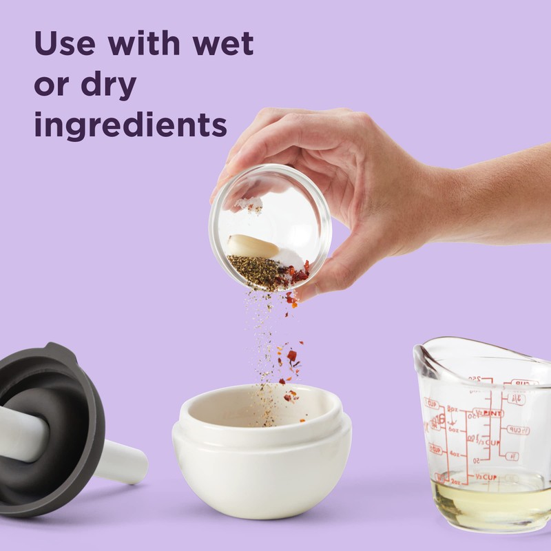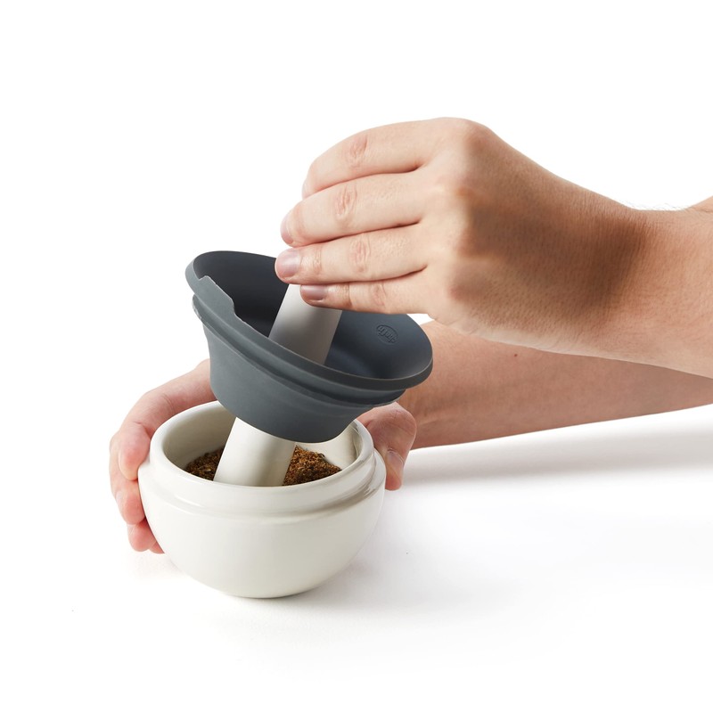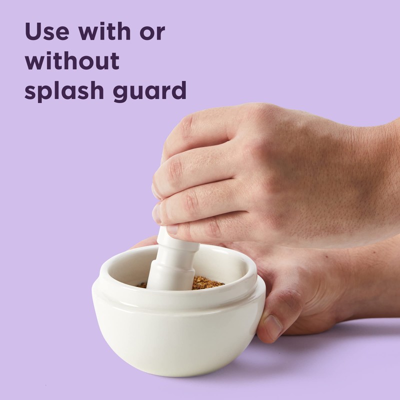 - DURABLE CERAMIC and SILICONE: The mortar and pestle set is made of durable ceramic for optimal spice grinding. The flexible silicone splash guard is easy to attach and remove.