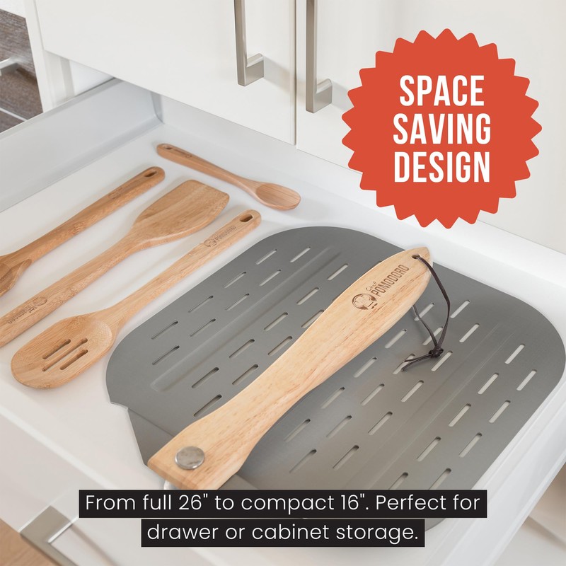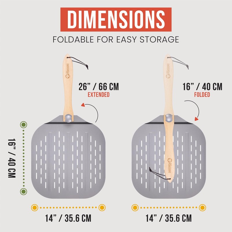 POMODORO's Aluminum Metal Pizza Peel with Foldable Wooden Handle was crafted specifically for the pizza maker, home chef and artisan baker. Designed with function and practicality in mind, the aluminum metal is made from commercial grade aluminum for durability and withstanding high temperatures. With an 11-inch foldable wooden handle, it can easily be folded inward to save space, making it easy to store. The paddle is a perfect match for any kitchen décor, gourmet pizza parlor and bakery. It's incredible strength prevents warping and subdues heat from transferring pizza and baked goods to and from an oven/grill.