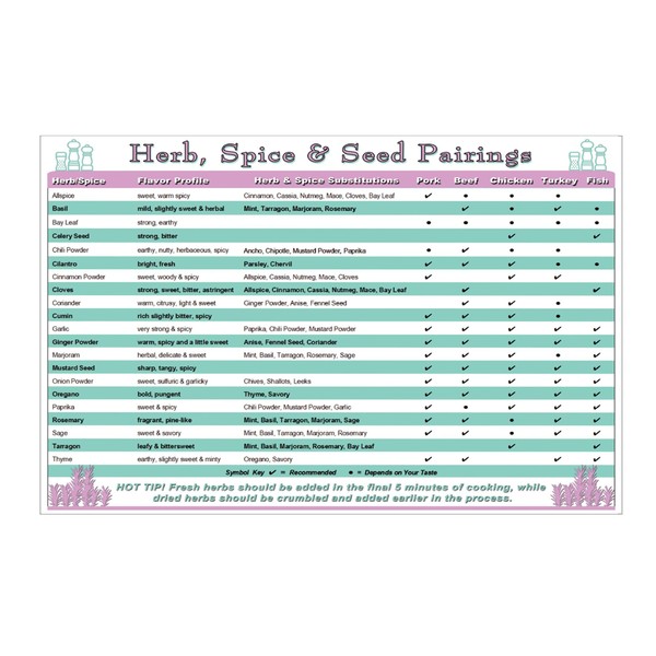 - HERB, SPICE & SEED PAIRINGS & KITCHEN CONVERSION CHART – Our double sided laminated chart details the herbs, spices and seeds with proteins and the conversion measurements for that cook! One Large Print chart tells it all! Not a magnet so your fridge doesn’t look like a clutter mess.