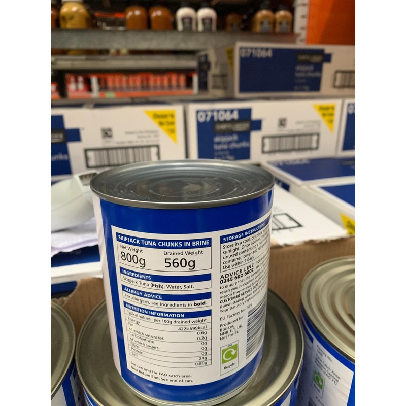- PACK SIZE: Large 800g tin of skipjack tuna chunks in brine with a drained weight of 560g, perfect for catering and food service needs